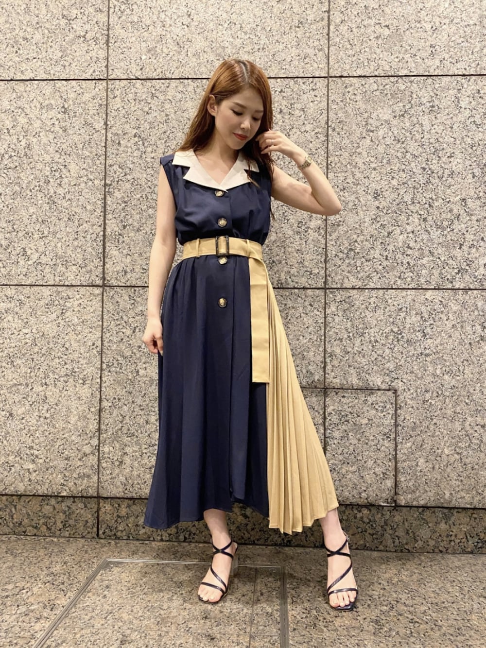 mutsumiのワンピース「襟配色サイドプリーツワンピース」を使ったコーディネート