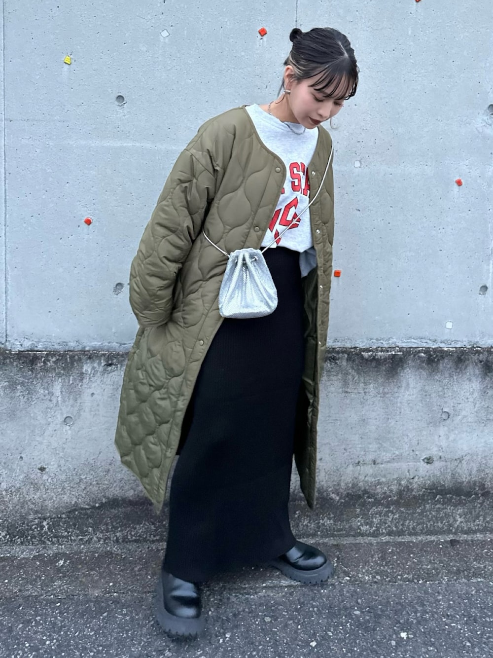 megumiのノーカラーコート「キルティングロングコート」を使ったコーディネート