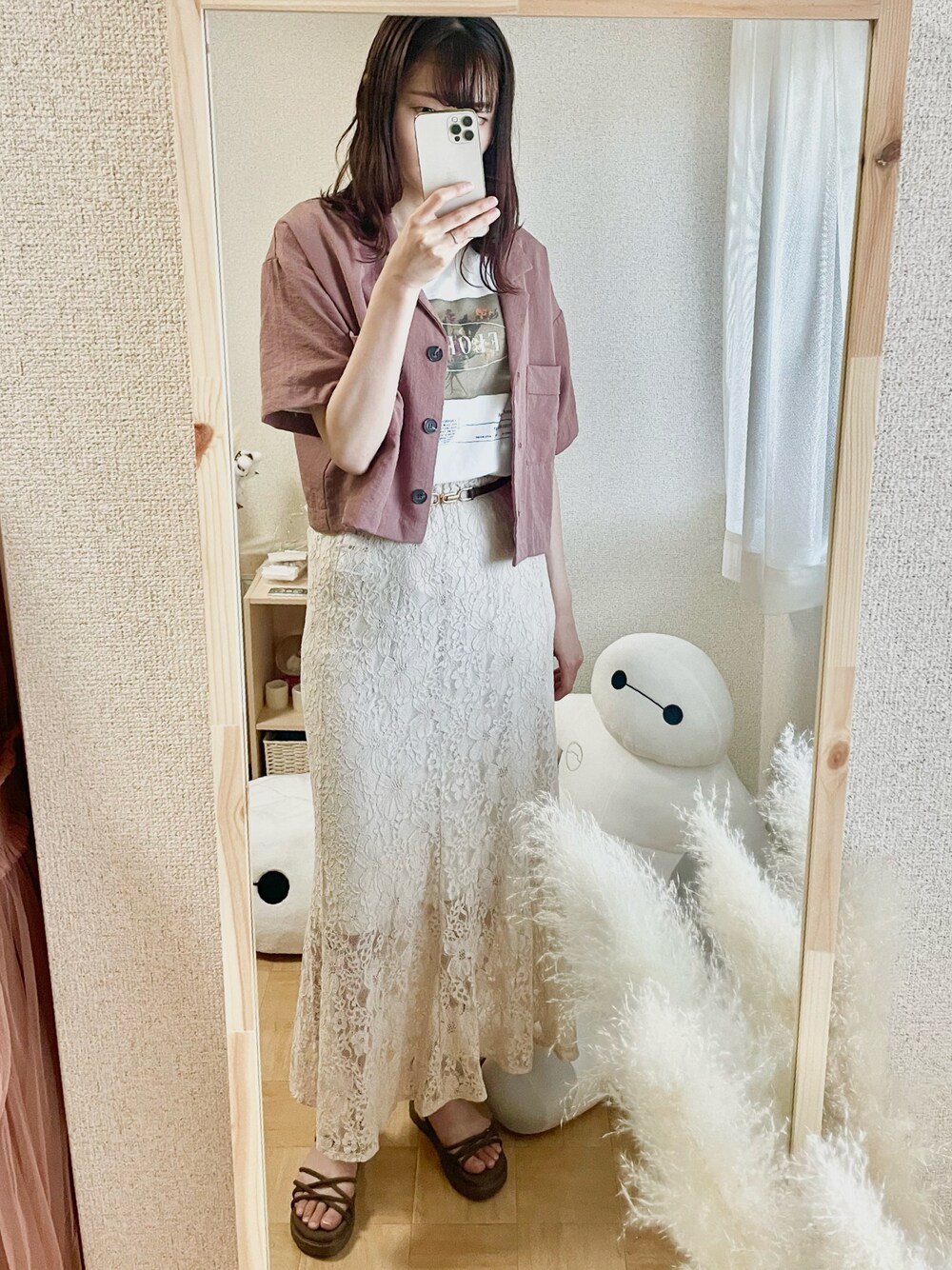 ご覧いただきありがとうございます✩.*˚ ショートシャツの着回しコーデ⸜🌷︎⸝ レーススカートと合わせてみました❁¨̮