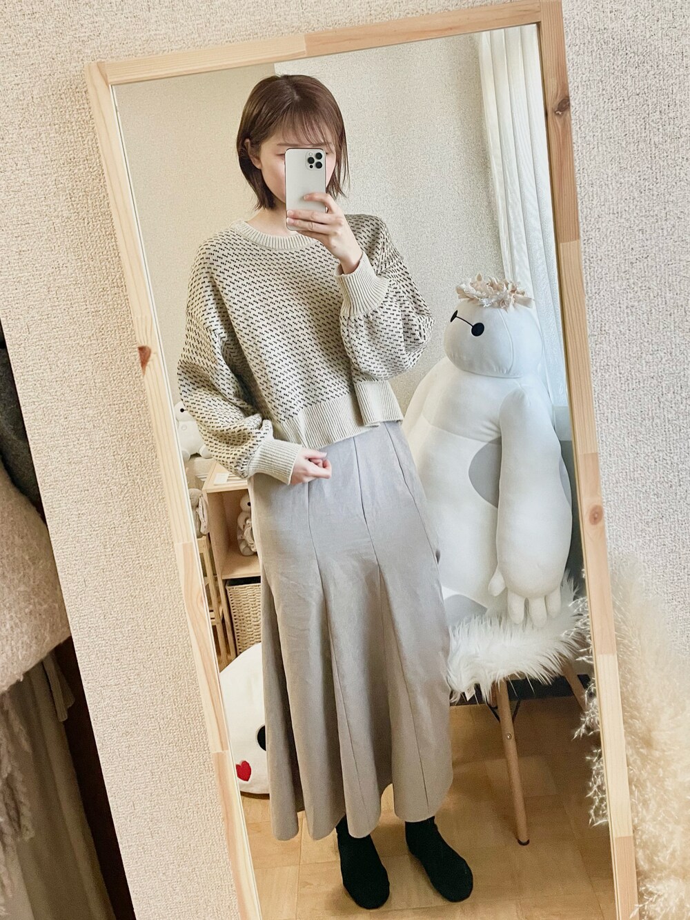 ご覧いただきありがとうございます𓍯 このニット丈が短いので スカートとしか合わせられない(><) 最近購入したスカートとの相性は◎