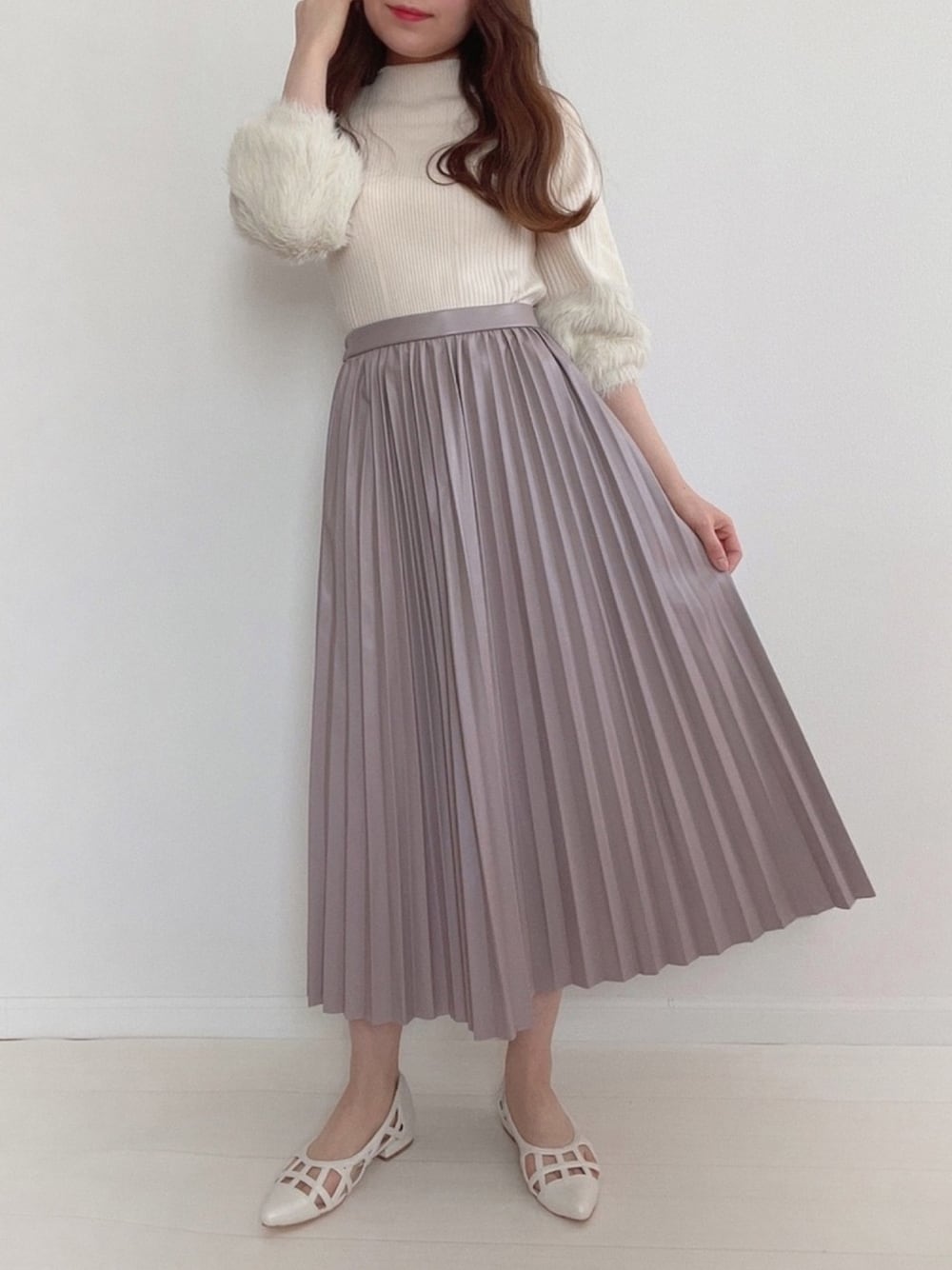 GUのフェイクレザープリーツスカート 落ち着いた色味なので高見えします!
