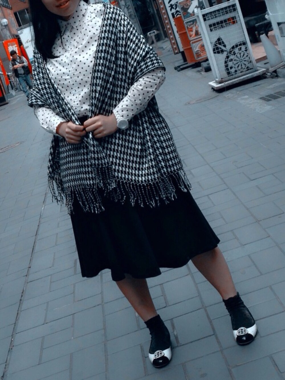 white & black の two tone code。 千鳥のストールで少し上品さを出しました。