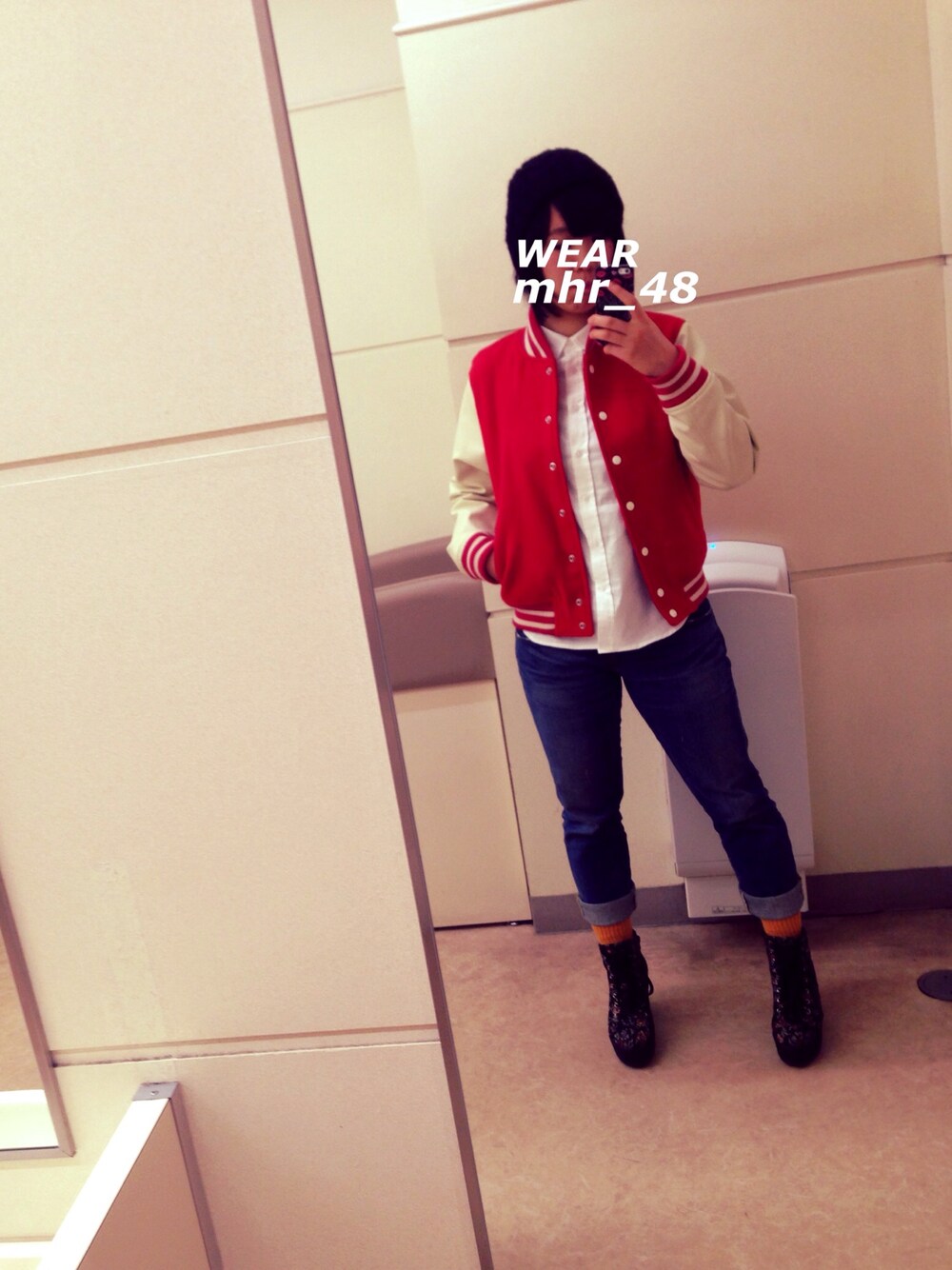. ボーイッシュ に してみました 。 すこし 軽さを 出したくて 白シャツ にあえて 赤の スタジャン 。