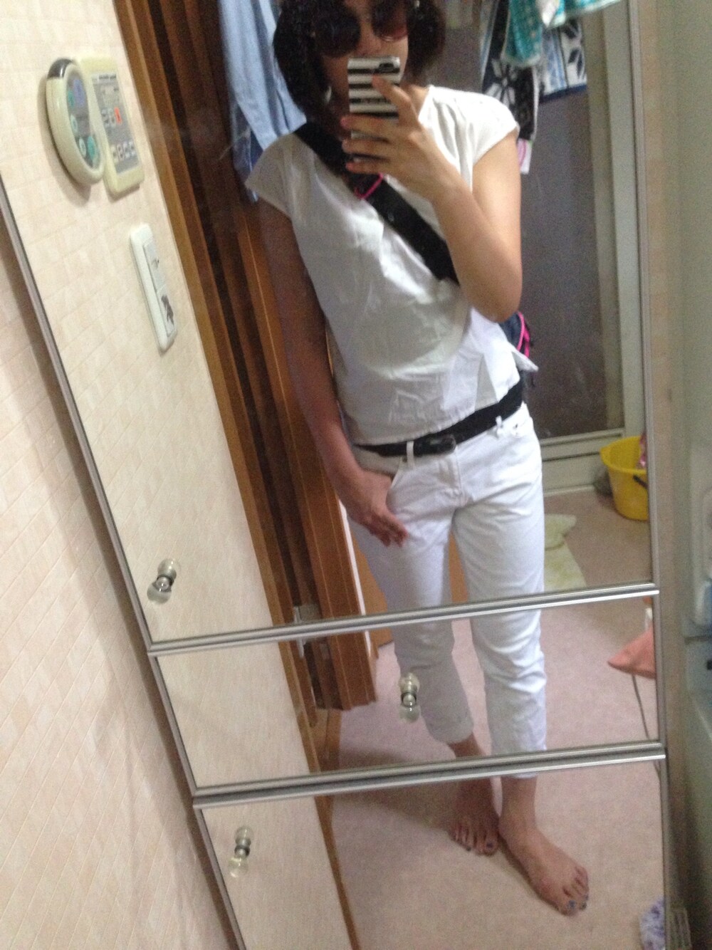 オールホワイトでボディバックの フェスコーデかと思いきや すっぴんで日焼け止めだけ塗って 近くのスーパーに買い物に行った だけの出不精 ꒰ *‾ʖ̫‾ ꒱ 二の腕のムチムチが気になりますなぁ あ、ニット帽は見つかりました。