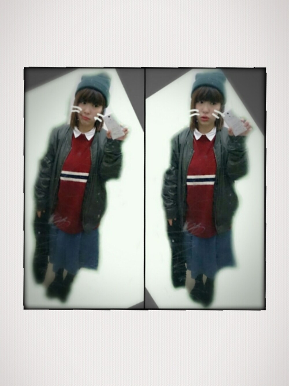 ニット帽(緑) / さんきゅーまーと シャツ(白) / WEGO ニット(赤) / WEGO デニムスカート / WEGO