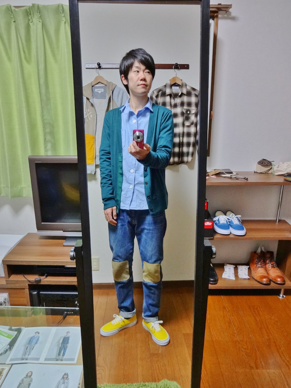 寝起き直後で顔のむくみが・・ 今日のコーデ。発色の良いスニーカーを際立たせるために全体的に暗くなるようにしたつもりです。