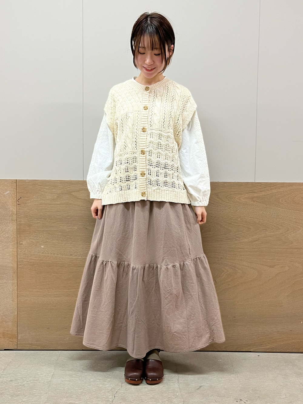 ミミのベスト「スラブパッチワーク前後2WAYニットベスト」を使ったコーディネート