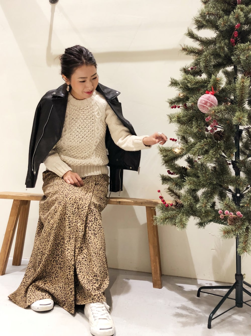 大好きなトーン合わせのスタイリング☺︎ レオパード柄のスカートは主張しすぎない小柄で♡生地感もテロっとしていて、女性らしいシルエットが◎ 色んなところでクリスマスアイテムをみて、ウキウキする今日頃クリスマス🎄