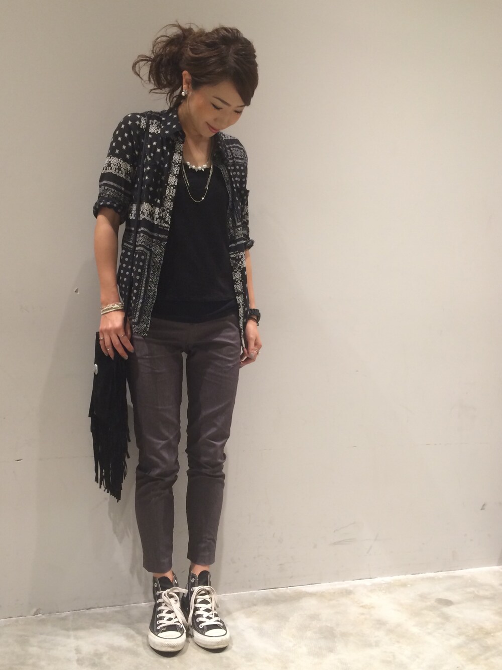 mi0808(niko and…イオンモール宮崎)のショルダーバッグ「フェイクスウェードフリンジコンチョBAG 564795」を使ったコーディネート