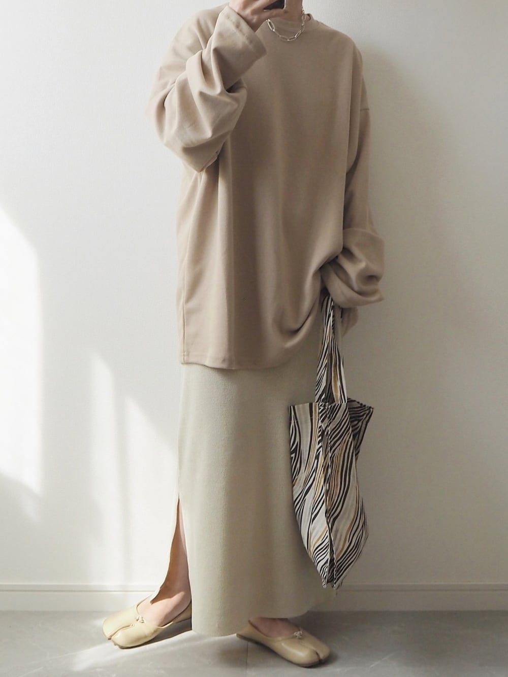 miのトートバッグ「パッチワークプリントバッグ」を使ったコーディネート