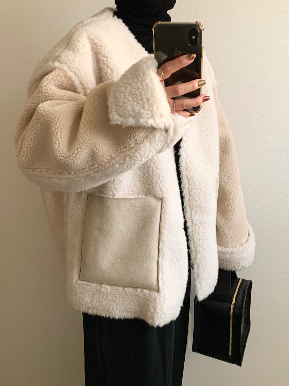 miのその他アウター「フェイクムートンパッチワークジャケット」を使ったコーディネート