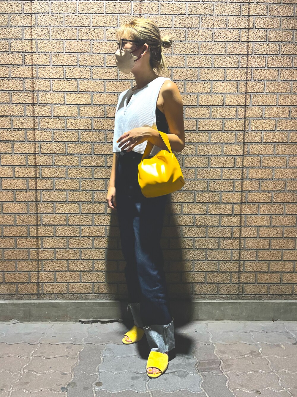 ちょい飲みコーデ🍻 シンプルだったので、小物イエローで揃えました💛 デニムはハイウエストなので低身長でも足長効果です🥹