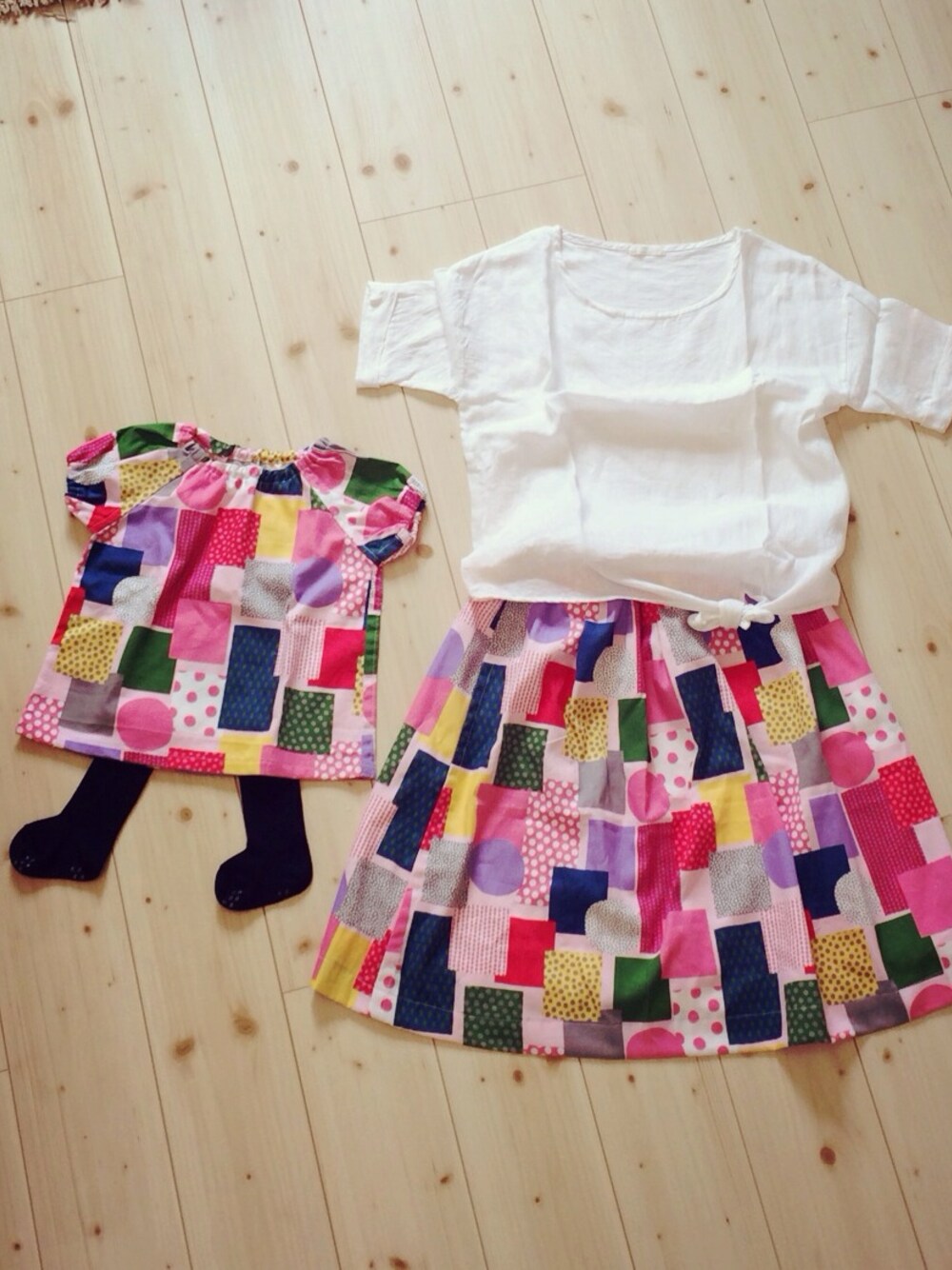 母 トップス ⁑ スタディオクリップ スカート ⁑ ハンドメイド 娘 ワンピース ⁑ ハンドメイド 靴下 ⁑ 無印良品 私の母メイドで 初めて娘とお揃い♡