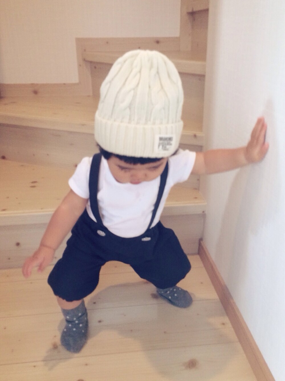 サロペット ⁑ ハンドメイド Tシャツ ⁑ 西松屋 靴下 ⁑ 無印良品 ニットキャップ ⁑ ブランシェス またまた私の母メイド登場♡ 布が足らずちょっとパツパツ…… あ、くるみボタンだけは私が作った‼︎‼︎ 座る瞬間の変な写真♡