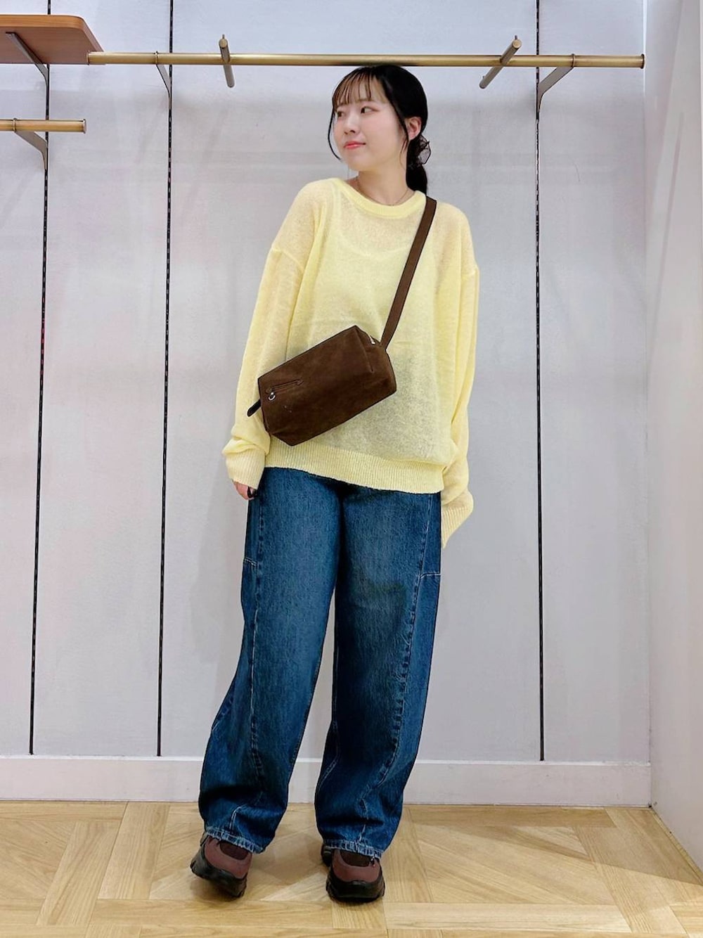 カラーコーデも小物で秋取り入れられます⟡.* 透かし編みのニットは涼しくなると、Tシャツやインナートップスを重ねて着るのも◎