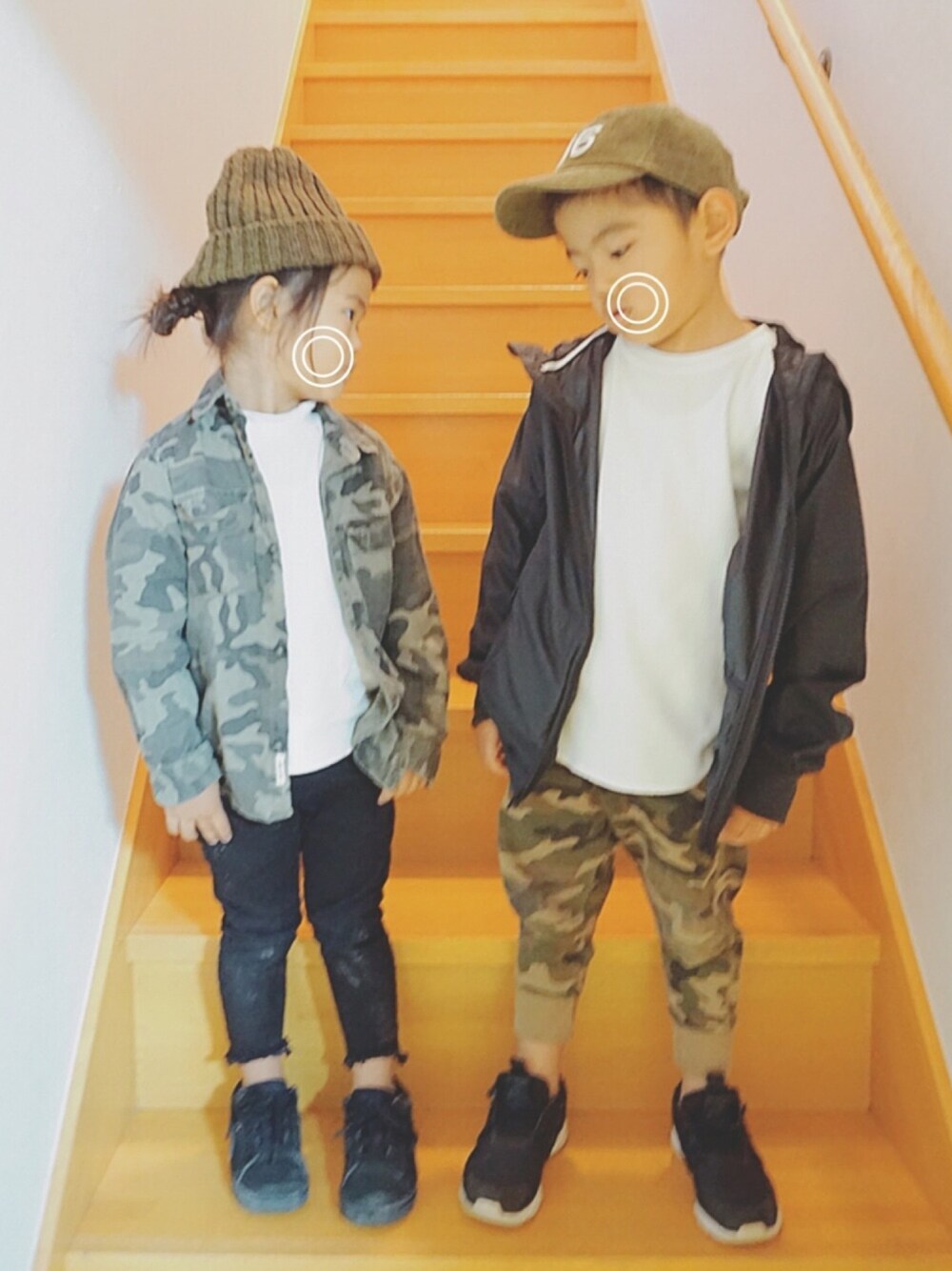 いつもご覧頂きありがとうございます♡ カモフラandブラックで 兄妹コーデ❤️❤️❤️ Daisoのコーデュロイキャップ 可愛いね♪ NIKEのウィンドブレーカーもお気に入り👻✨