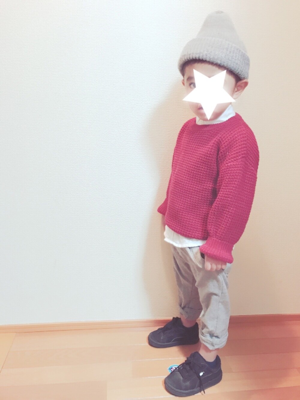 ご覧頂きありがとうございます♡ 今日は下の子の予防接種に行くので、おにぃは朝からじぃじのお家に遊びに行きました😉💕 グレー×ボルドー★ なんだかおじぃちゃんみたいな感じになりました😂笑