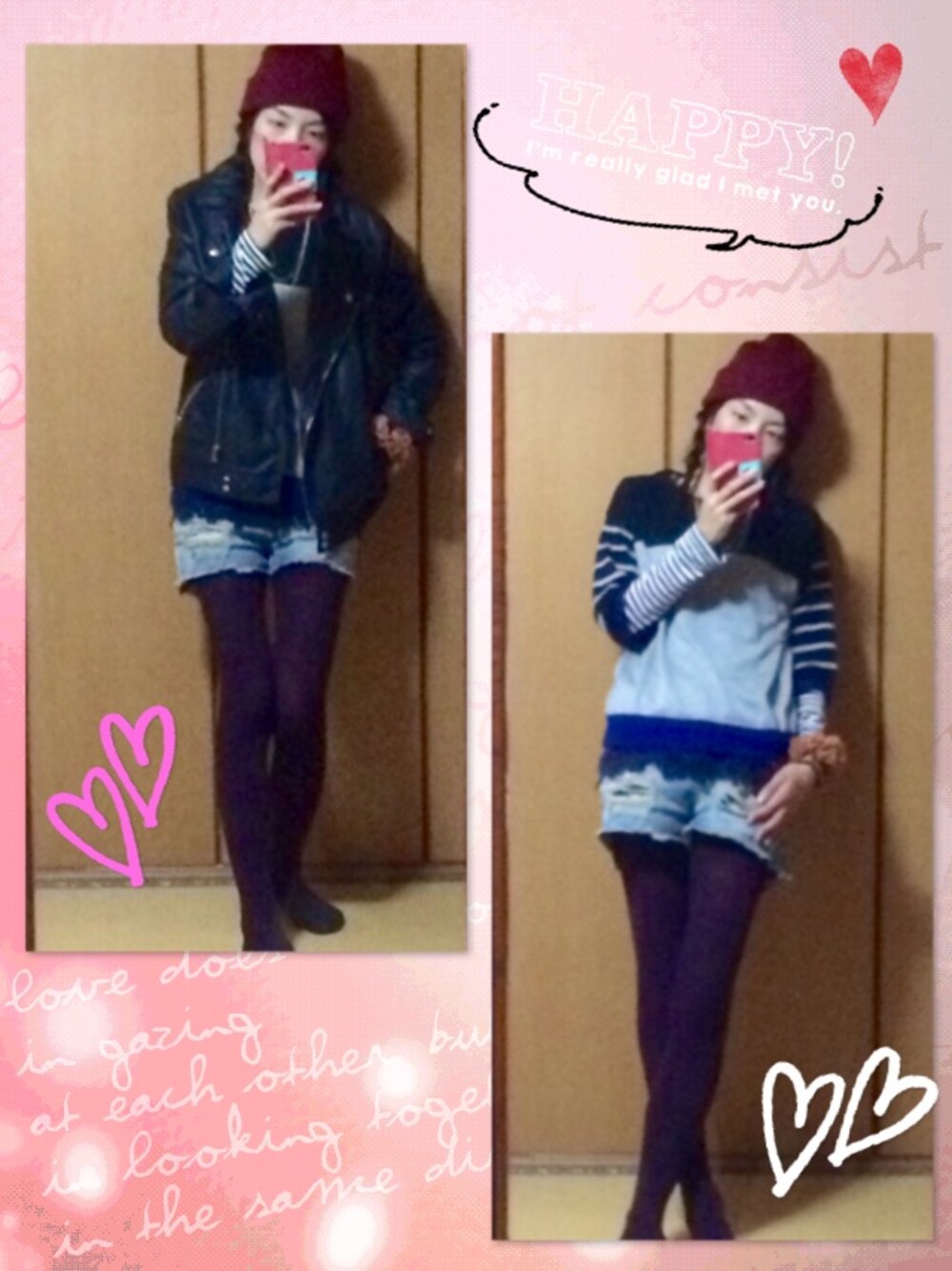 今日はちょっと、いつもと違ってカッコいい系してみました⤴︎ただ、ニット帽とニットタイツでエンジ系の赤を入れてバランス頑張った❗️と思われると嬉しいなぁ(≧∇≦)