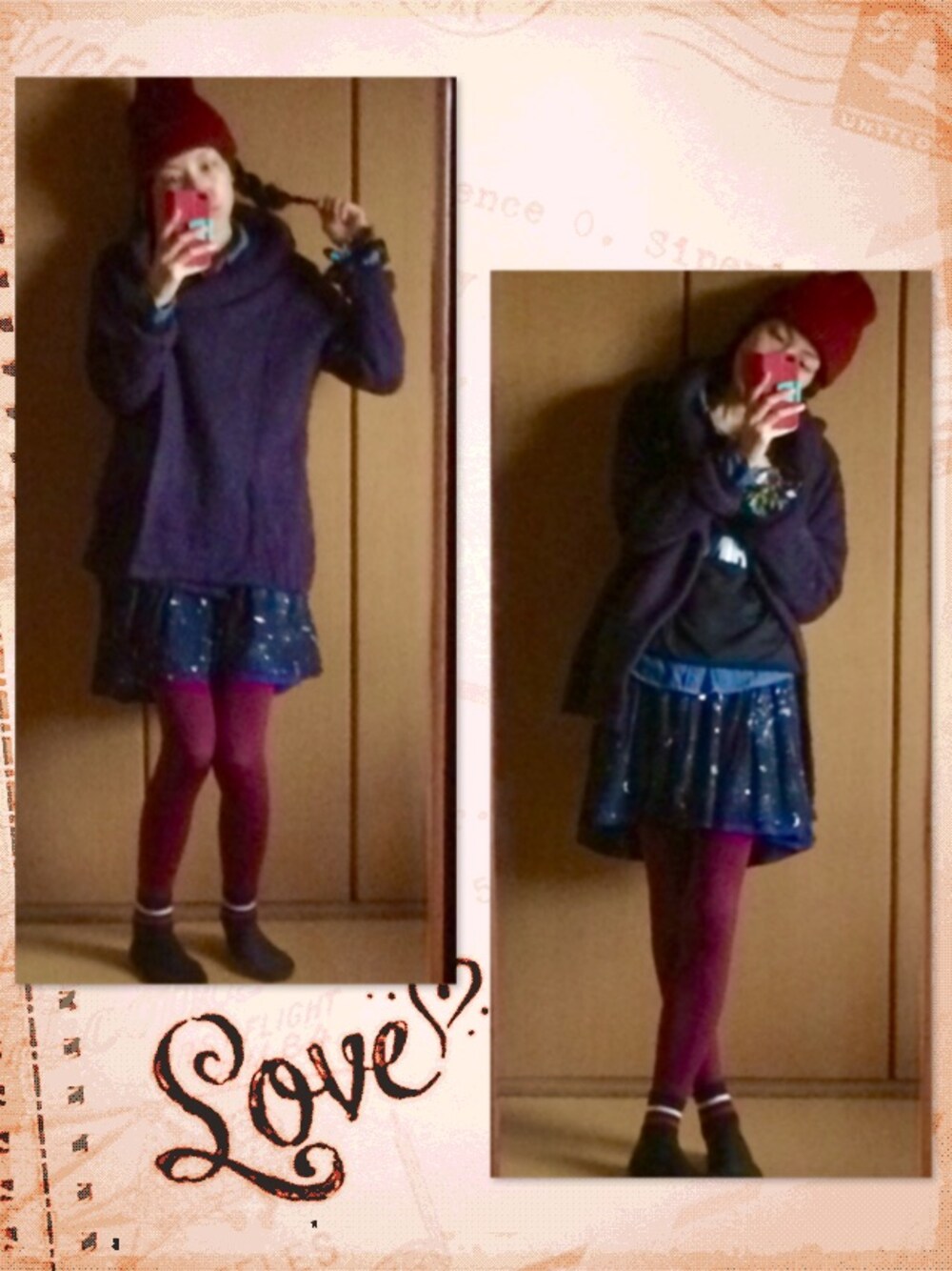ニット帽のタグを待ってました❤︎夜中からアップしちゃいます(*^◯^*)寝てる方ごめんなさい💦 みなさん、こんばんは★ 今日はタイツと帽子以外黒と紺のモノトーンコーデ★靴下はアクセントで履いてみたっちゃ(≧∇≦)