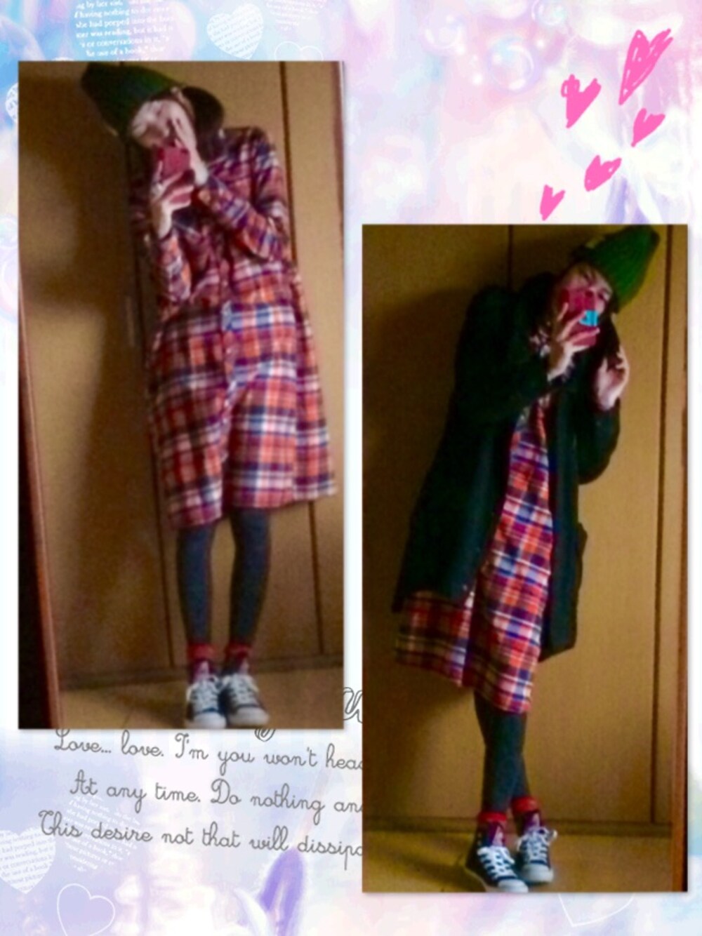 赤✖︎黒コーデ⤴︎チェックシャツが少し長めだったのでアウターも長めで★ 首元まで閉まるアウターだから暖か(*☻-☻*)靴下の二枚重ねだしね❤︎