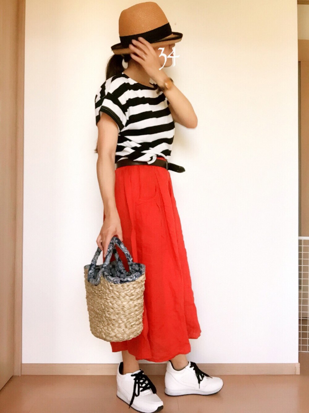 ◎゜*✤ SM2の赤いスカートを主役に、 暑い今日を乗り切るぞと 帽子を on◎ やはりボーダーは 定番で しっくり。 この前 earthのセールでお安く お迎えしたもの。 少し上品に着れて、買ってよかった*° 前までは 『夏はサンダル』だったけれど、 流行りに乗って スニーカー好きになったわたし。 でもやぱきもち涼しさ求めて、白いスニーカーで 爽やかにしました´`*