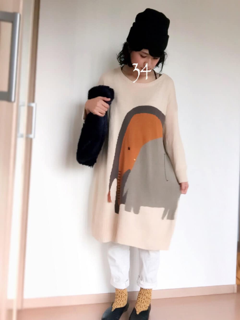 ゚・*:.。❁ おひめがぞうを 覚え たので、親子のぞうが インパクト大な ニットが主役のコーデ 𓂃𓃰 いつもはワンピース として着ているけれど、今日はパンツと 合わせたい気分 ⚮̈ 白×黒×やまぶき色 ◎ やはり、わたしはこの色が好きだなあ^^^ いつもいいね、saveありがとうございます(*_ _)