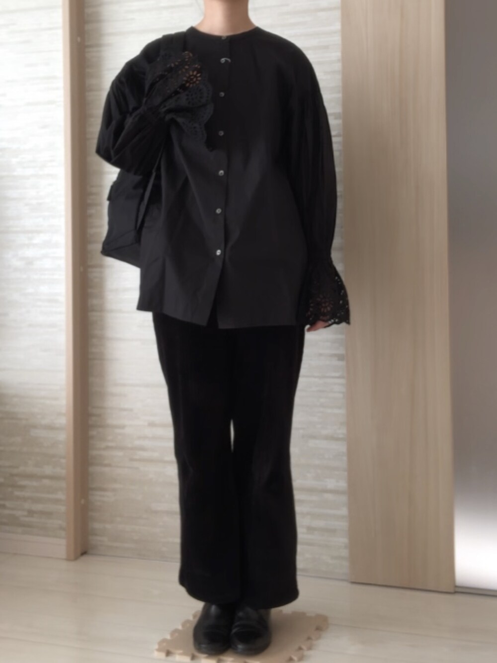 ドラマチックなデザイン袖のブラウスを使ったブラックコーデです。 モードな組み合わせにしたい日は、黒一色で決めるとそれっぽく◎
