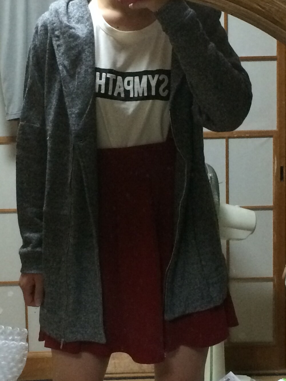 秋っぽいコーデにしてみた ボルドーのスカートで一気に気分は秋! インナーの白で明るめに。