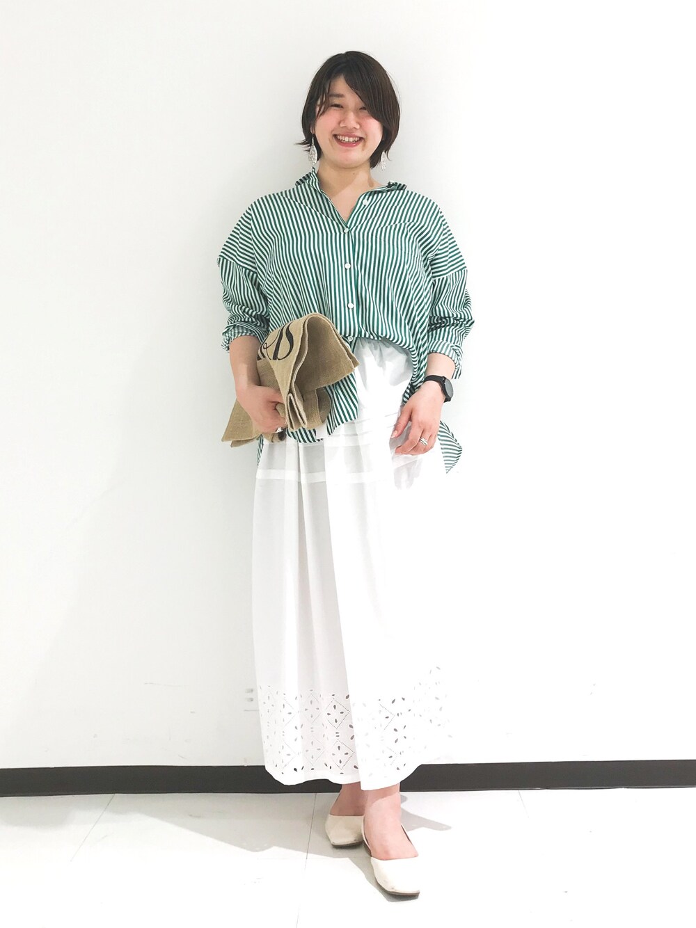 グリーンのストライプシャツは色味がしっかり出るようにサテン生地で作られています✨