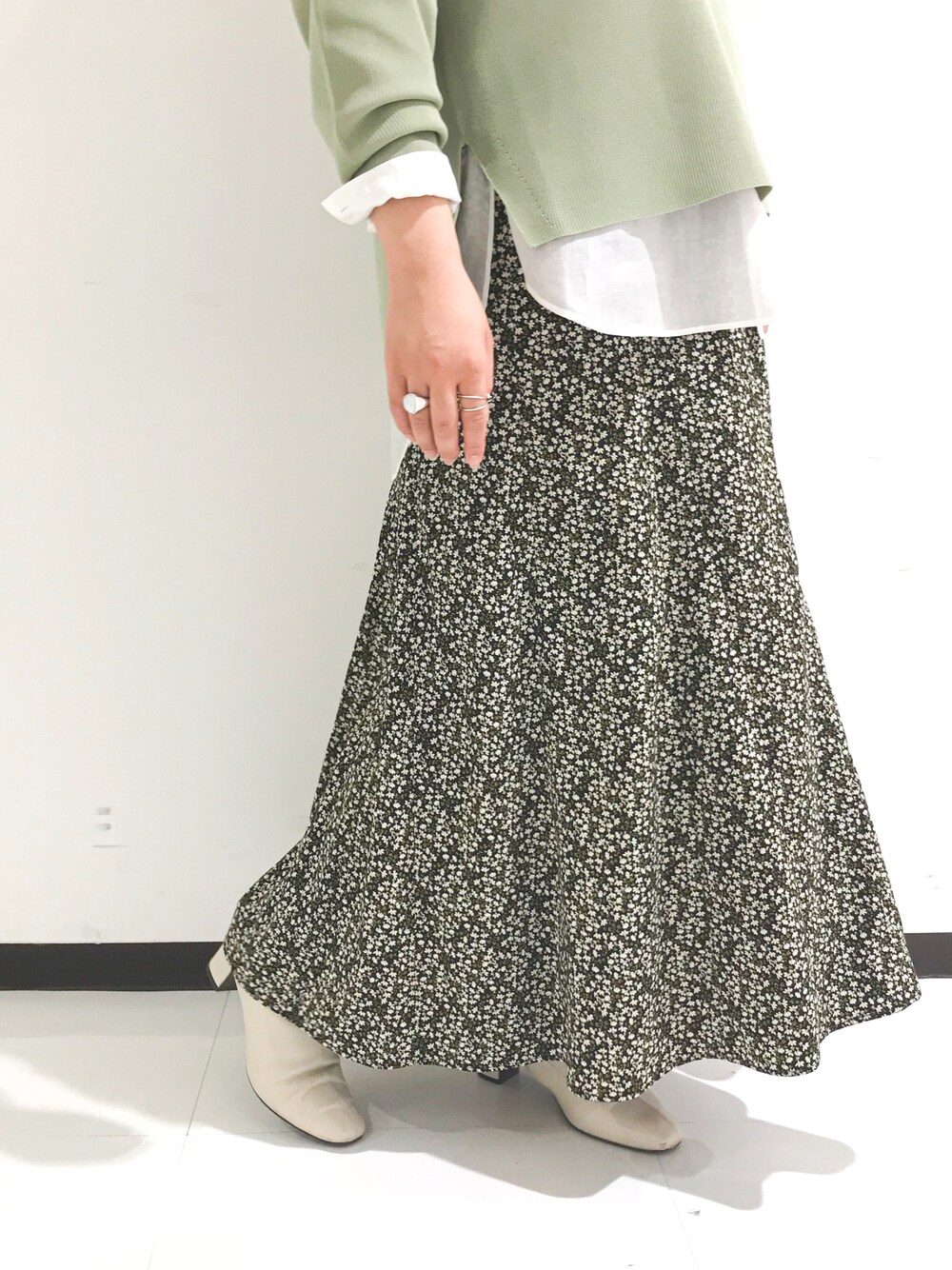 miki(オゥ バニスター 新宿高島屋店)のスカート「小花プリントマキシスカート」を使ったコーディネート