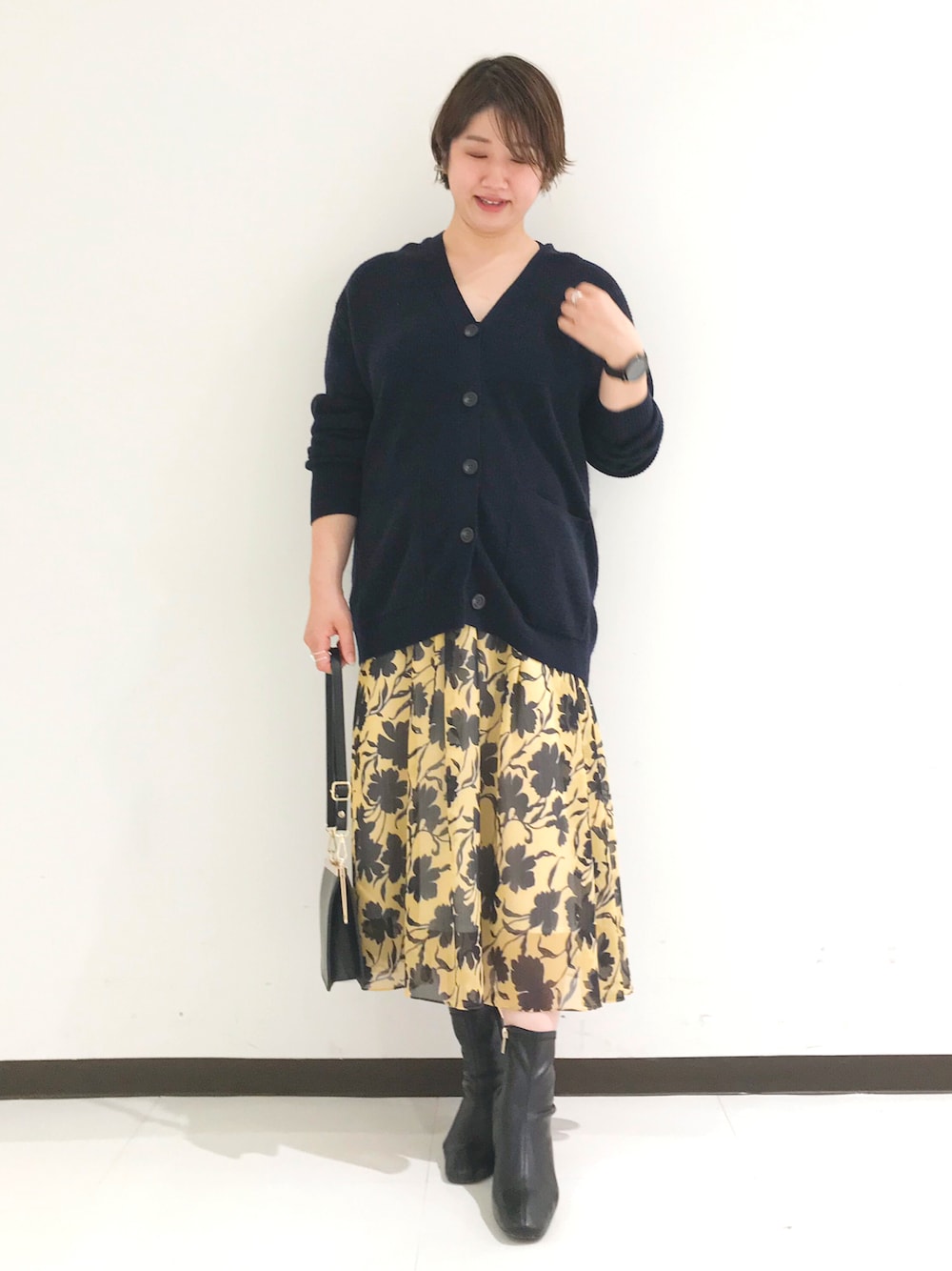 目を引くイエローベースの花柄スカートを使ったコーデ✨