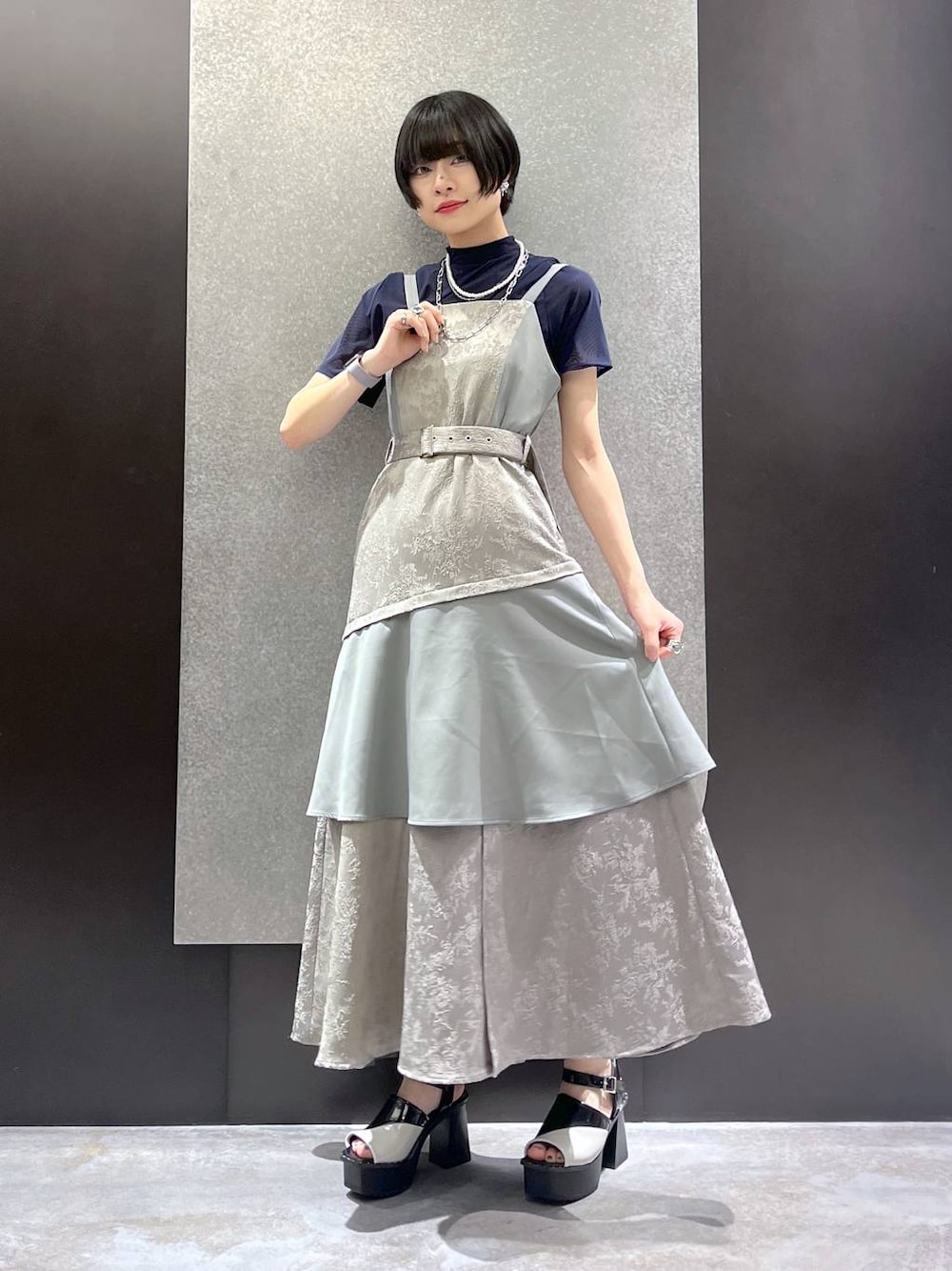 インナーは色味が異なり、気分やコーデに合わせて色味を変えて着ることができるリバーシブル仕様! ワンピースは凹凸感のあるジャガード素材を使用し、立体感があり上品見えする 無地生地との切替デザインでメリハリのある印象に 肩紐で長さ調節が可能 フロントにスリットがあり、女性らしく着用できます