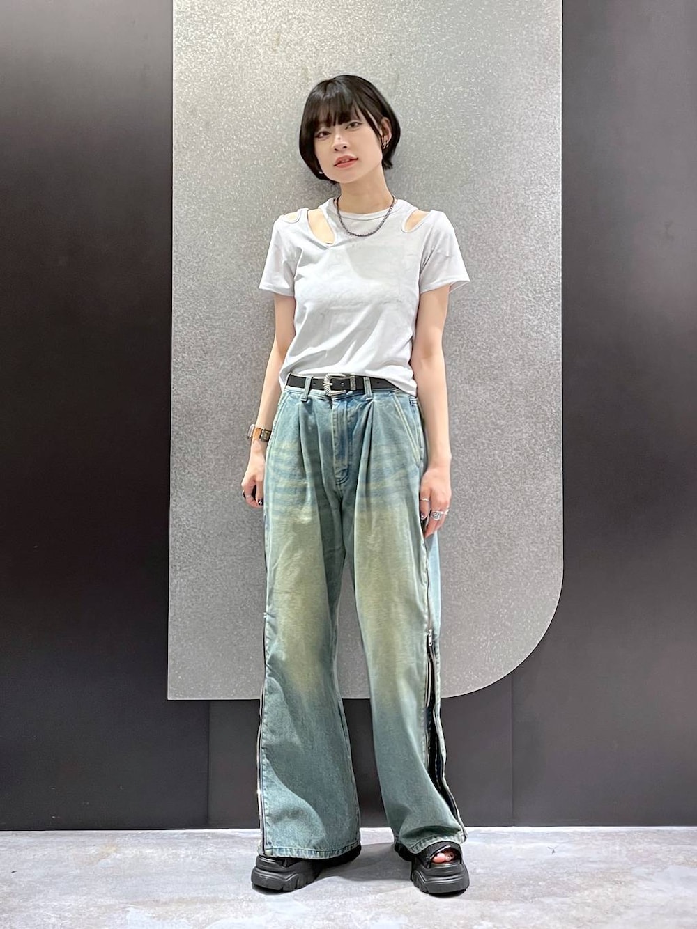 肩部分のカットアウトデザインがポイントの グラフィックリブトップス 伸び感のあるリブ素材でストレスフリーに着ていただけます。 デニムはサイドジップのデザインが差別化出来るアイテム。 サンダルやスニーカーなど、靴を選ばず履いていただけます👞