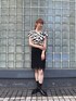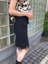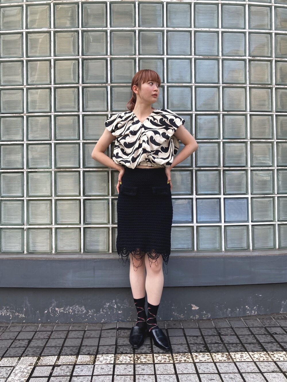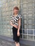 波のシルエットプリントの夏らしいトップスとブラックのニットスカートで女性らしいスタイル。足元もブラックで合わせたモノトーンコーデ。 着用 : 172cm 38号 PR assistant : MIREI