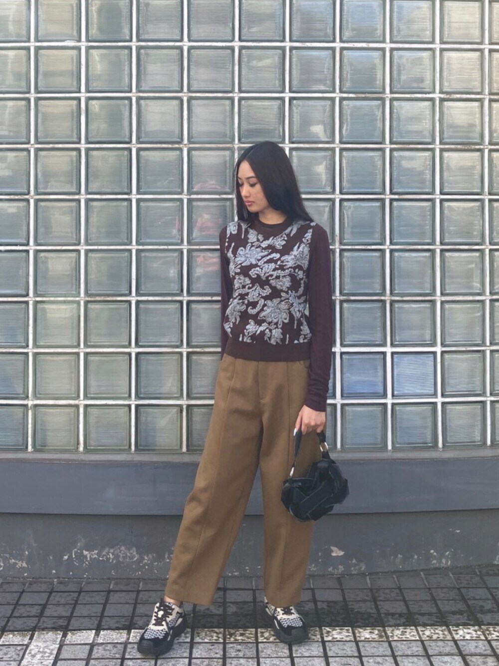 秋を感じる花柄ベストは、着こなしに個性的なアクセントを与えてくれるアイテム。 ボリューム感のあるパンツはモダンで上品な印象を表現。 着用: 170センチ 38号 PR assistant: ATHICHAR
