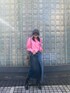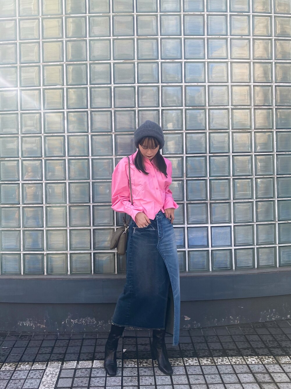 JNBYのボタンを掛け違えたようなユニークなデザインのシャツと、アシンメトリーな切り替えがお洒落なデニムスカートで、エレガントな秋のカラーシャツコーデ。 ニット帽やロングブーツなどのアイテムをプラスして秋らしく。🍂 着用 : 172cm 38号 PR assistant : MIREI
