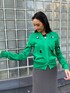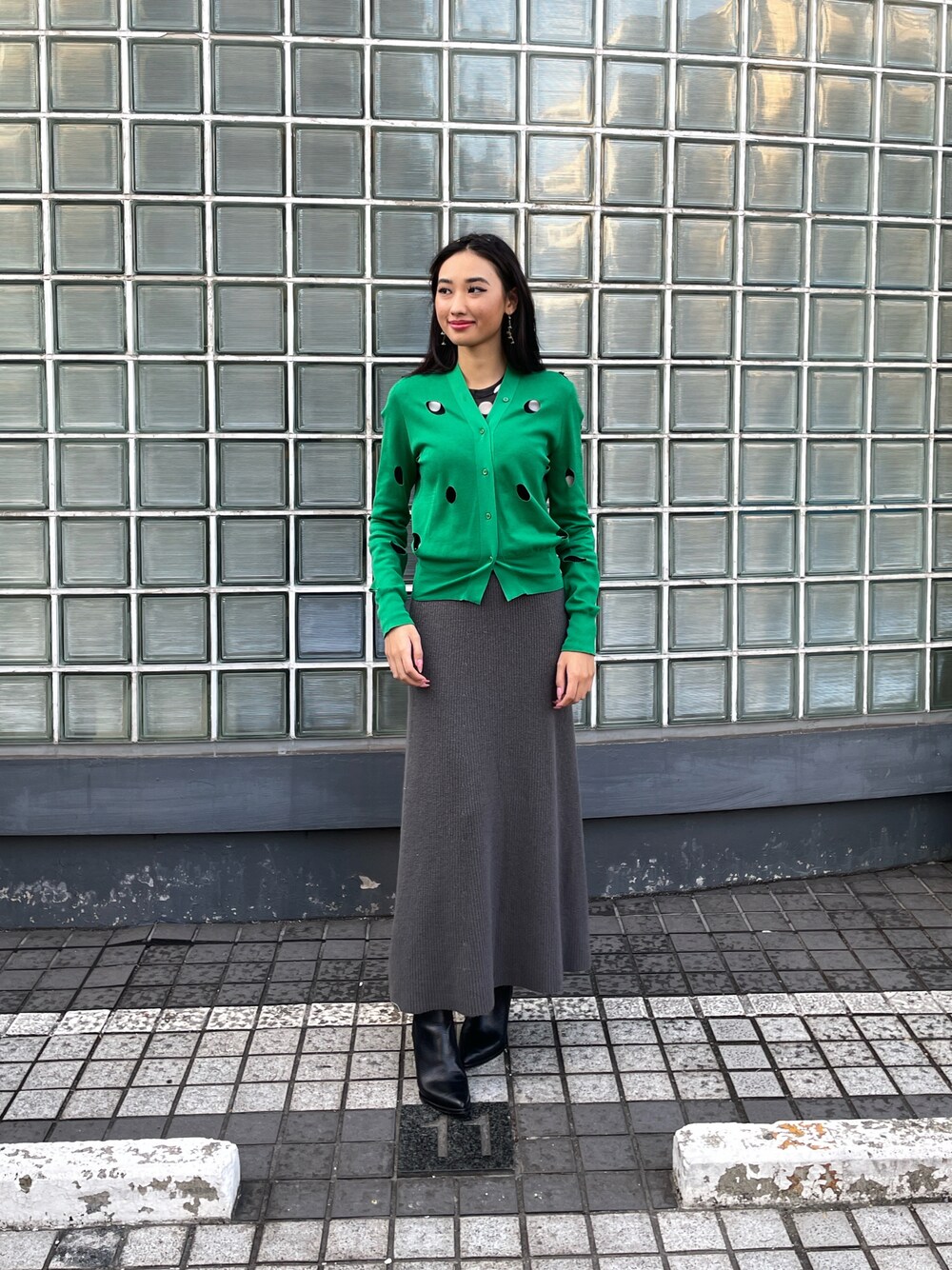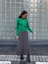 グリーンが彩かなはドットのカットアウトでインナーのカラーが見える個性的な1着。ロングスカートは、裾のフレアライがおしゃれ。 着用:170センチ 38号 PR assistant: ATHICHAR
