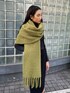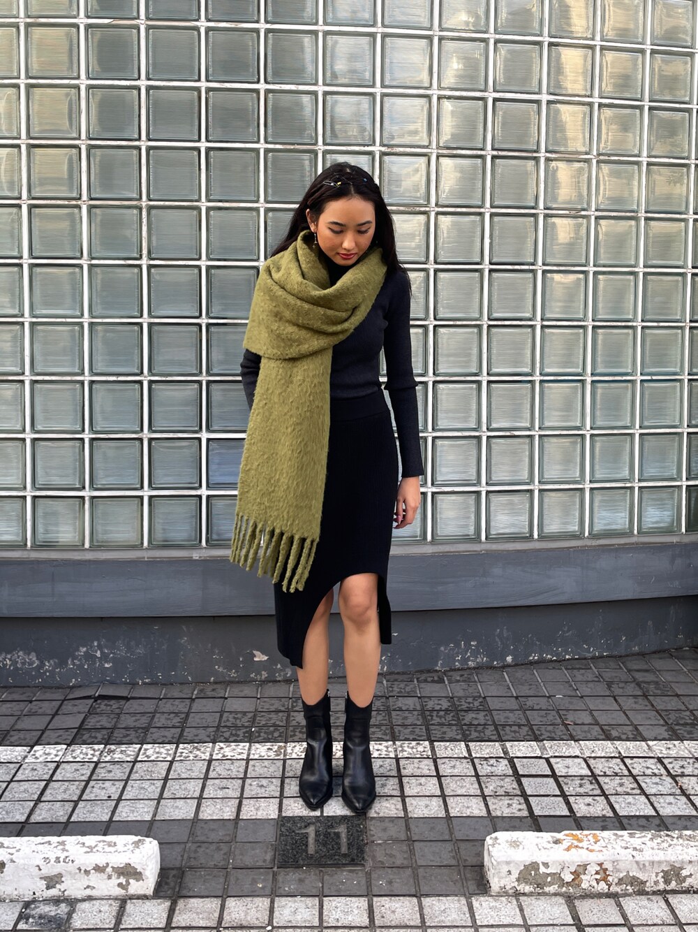 ボリューム感のあるフリンジマフラーは柔らかくてあたたかく、程良い厚みもあり、巻き方をアレンジして楽しめます。ニットとスカートをあわせてエレガントな雰囲気。 着用: 170センチ 38号 PR ASSISTANT: ATHICHAR