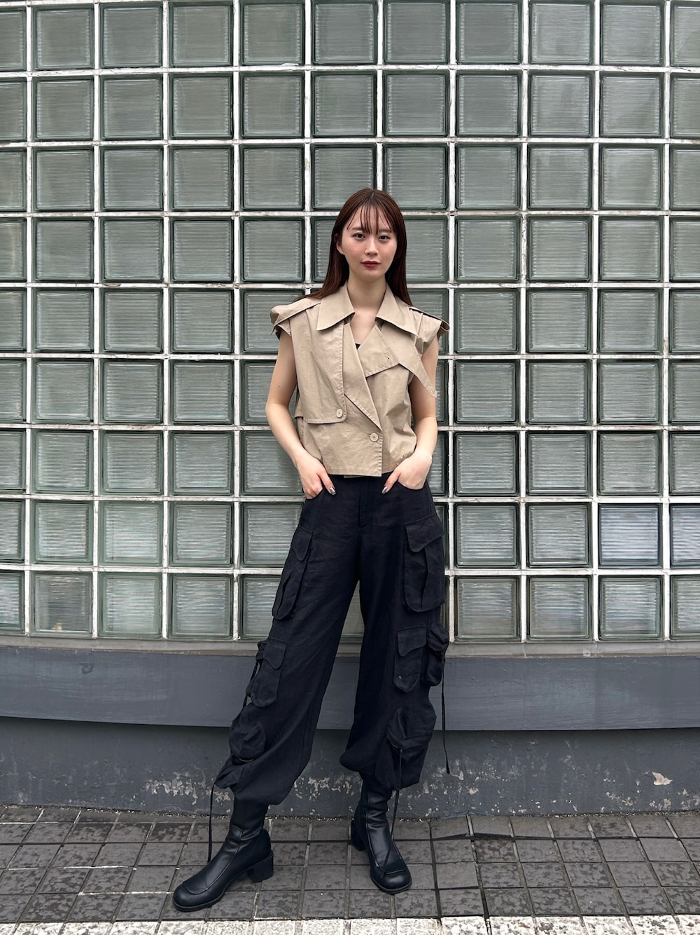 トレンチベストとブラックのカーゴパンツでクールに。 薄手のカーゴパンツはブーツにインするとバランス良く着こなせます!! 着用 : 172cm 38号 PR assistant : MIREI