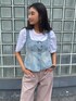 コルセット風のデニムベスト。Tシャツやデニムパンツと合わせてカジュアルに着こなすのがオススメ。ショート丈なのでスタイルアップ効果も狙えます。 着用:170センチ 38号 PR ASSISTANT:ATHICHAR