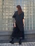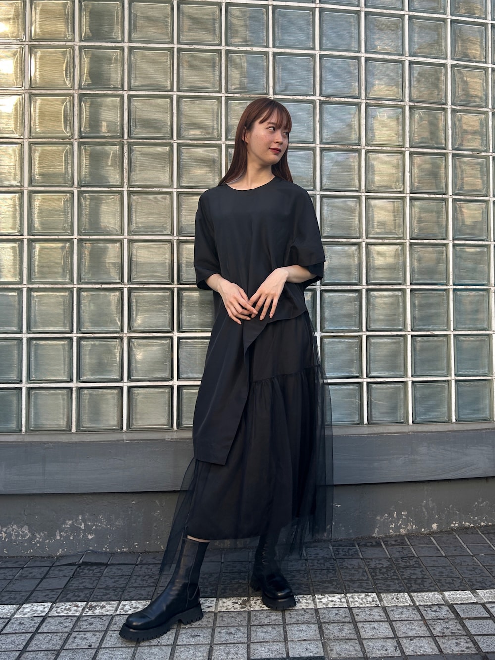 JNBY AW2024コレクションが販売スタート!! アシンメトリーのトップスに、チュールスカートを合わせて、大人っぽくオールブラックなスタイル。 着用 : 173cm 38号