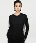 軽やかで透け感のあるチュール素材を使用したレイヤードトップス。同素材のスカートと合わせてコーディネートに。 着用:170センチ 38号 PR ASSISTANT:ATHICHAR