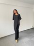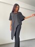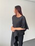 シルクの光沢感が上品なクルーネックブラウス。左袖はポンチョ風のシルエットで、エレガントなスタイル。フレアパンツ合わせるのがオススメ。 着用:170センチ 38号 PR ASSISTANT:ATHICHAR