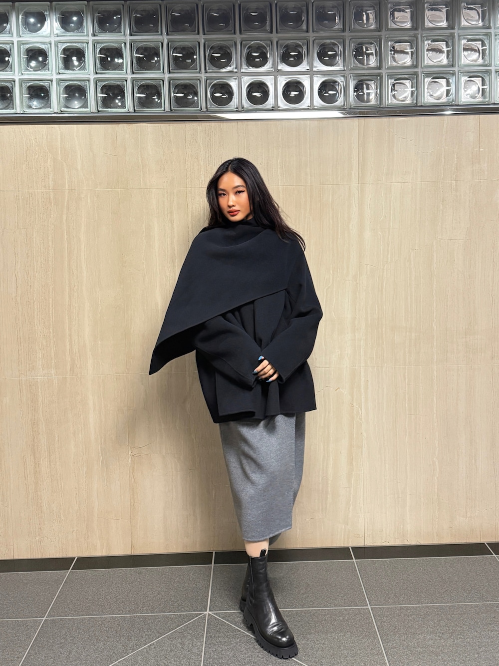 クラシカルなスカーフネックデザインのジャケット。スカーフ部分はス ナップで取り外しができ、シンプルに垂らして2通りのスタイリングが 楽しめます。スカートと合わせておしゃれを引き立てる。 着用:170センチ 38号 PR Assistant:ATHICHAR