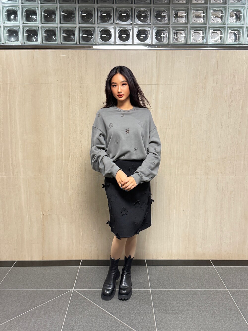 ドロップショルダーのスウェットシャツ。蝶々の刺繍と部分的にあしらったスパンコールが女性らしい。フラワーモチーフのカットワークが美しいタイトスカートと合わせてベーシックなスタイルに華やかさをプラス。 着用:170センチ 38号 PR Assistant:ATHICHAR