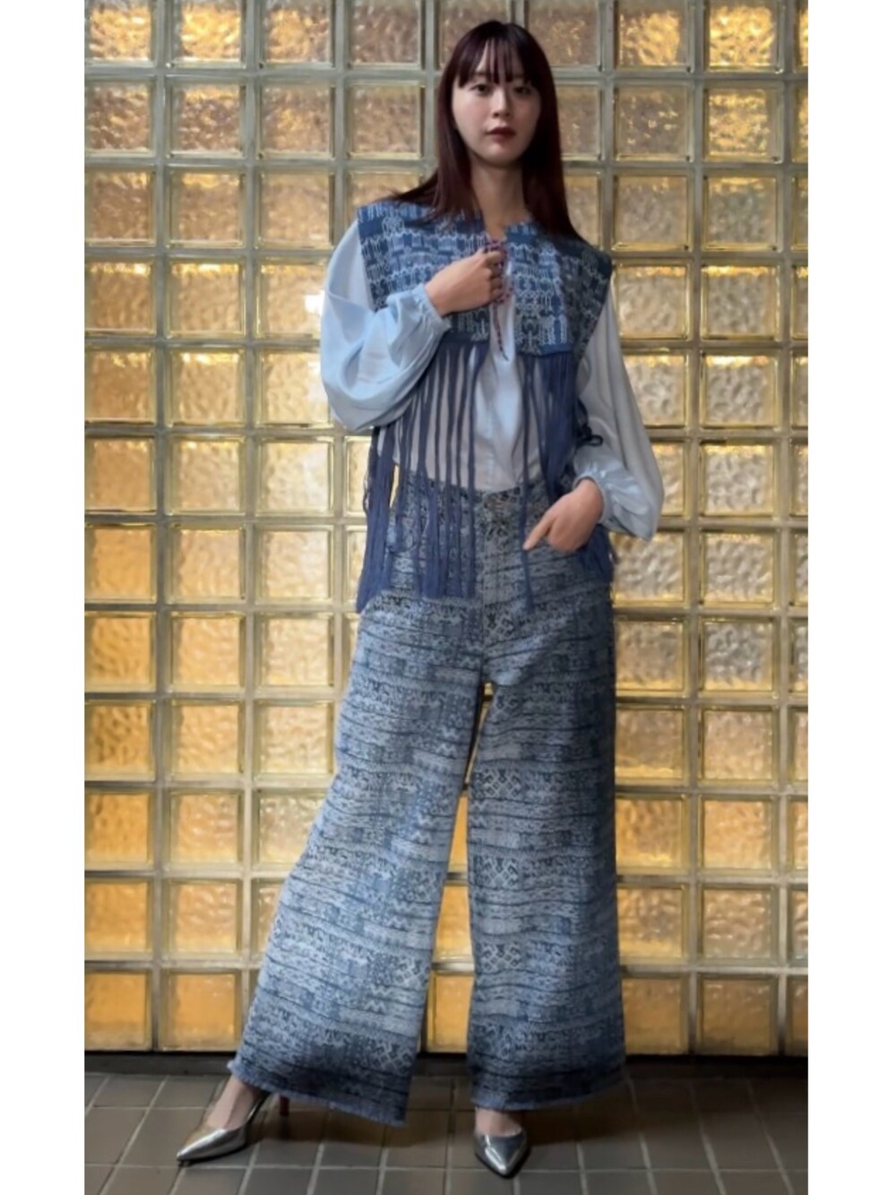 幾何学調のシカ柄とロングフリンジがポイントのジレとスモックブラウスをレイヤード。 ジャカードデニムに合わせてモダンな印象に。 PR assistant 着用 172cm 38号