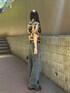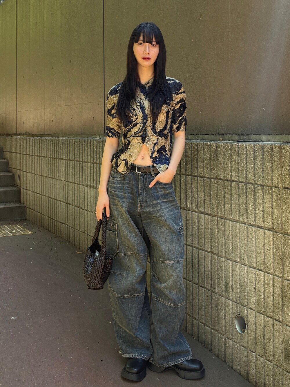 タイトなブラウスと太めのデニムを合わせてカジュアルにコーディネート。 上品なブラウンカラーのメッシュバッグをポイントに。 PR assistant 着用 172cm 38号