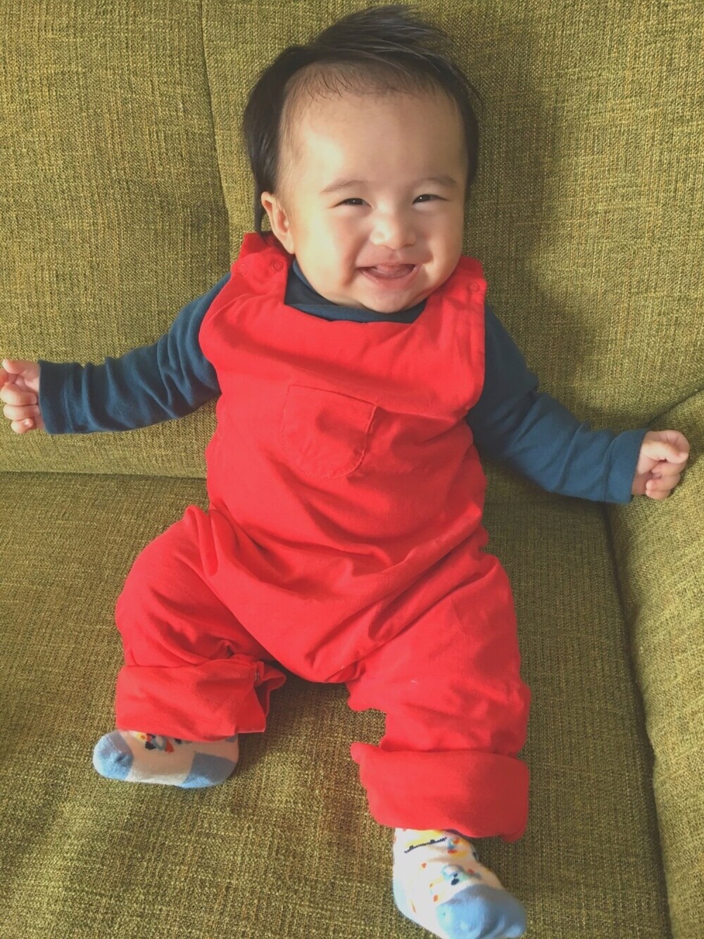 プレゼントでいただいた 赤のサロペットがお気に入り♡ 少しサイズが大きいので、 足は折ってます✌︎ インナーはタートルネックやのに 首が短すぎて、お肉で隠れてます笑
