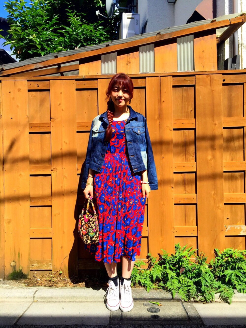 梅雨の晴れ間、あっついですね🌞 眩しくて目開けてられへん朝でした😵 派手で暑苦しい柄と色味のノースリワンピ、個人的には大好きな青×赤×花柄でお気に入り👗💗 夏 全開感 。 足元はスニーカーで楽チンに👟