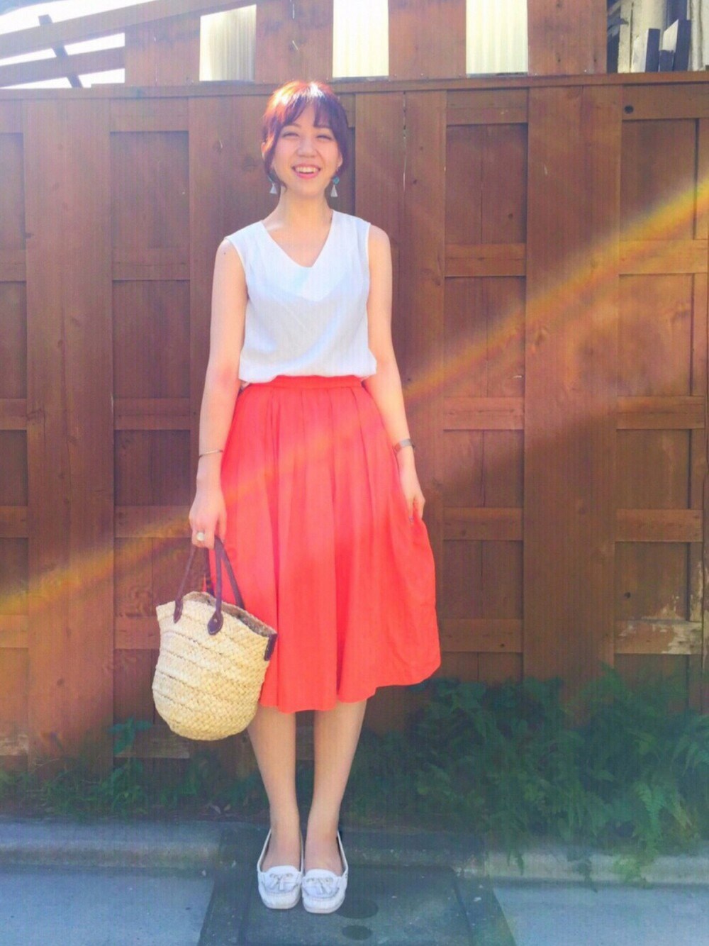 今日はジーナシスの オレンジ強めのミモレ丈スカートが主役です🍊 その他は白でシンプルに☺️ 見えないけど、後ろでくるくるっとまいた髪をくるりんぱしてます🎀 今日はめちゃくちゃ笑ってる写真になってしまった...😂笑